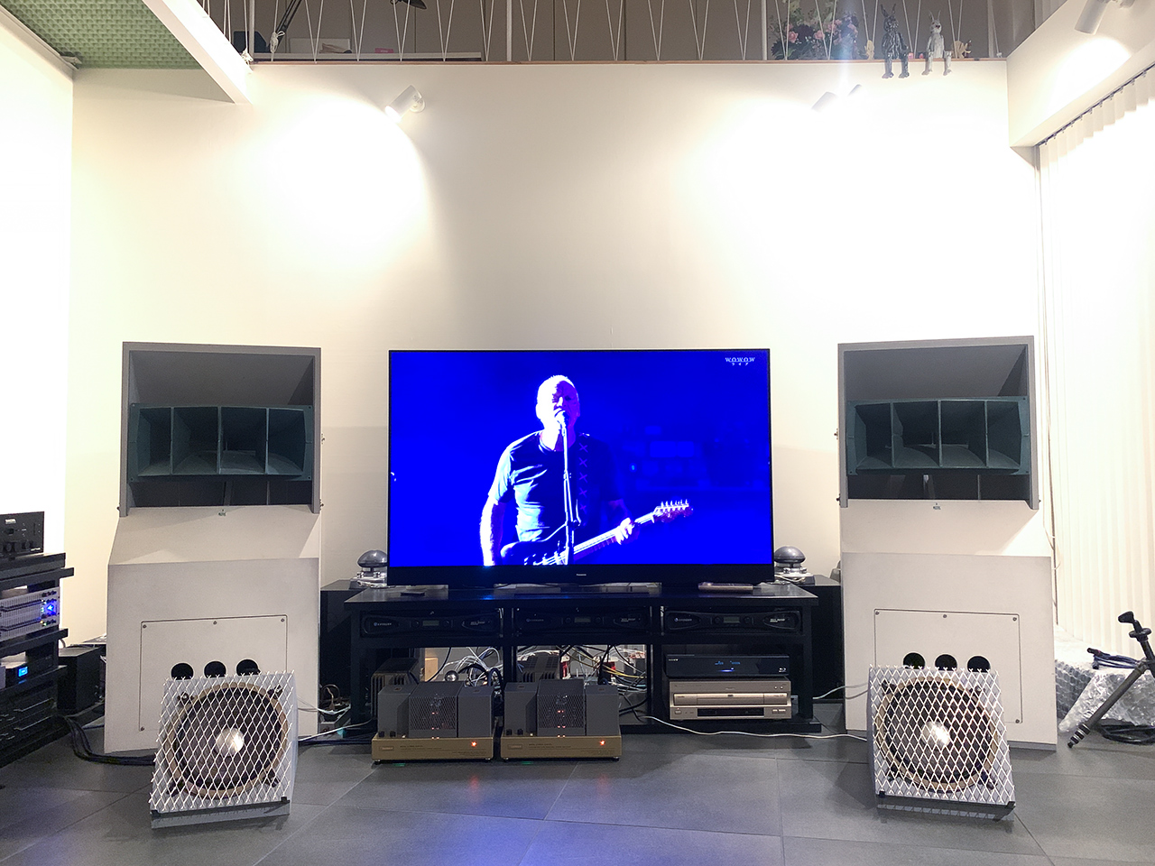従来スーパーツイターELAC 4PIはスタンド設置でALTECホーンの横に配置していたが、祭壇の燭台のような外観がイヤなのでサブウーファーの中央に置いた。位置的には懸念もあるが、見た目と安定性を優先。改造サブウーファーと4PI、ELAC製拡張ディバイス群(笑)はメインスピーカーの奥にある。写真は完成形。バックライトも効果的になり、音のヌケ感と見晴らしが大幅に向上した印象あり。 |