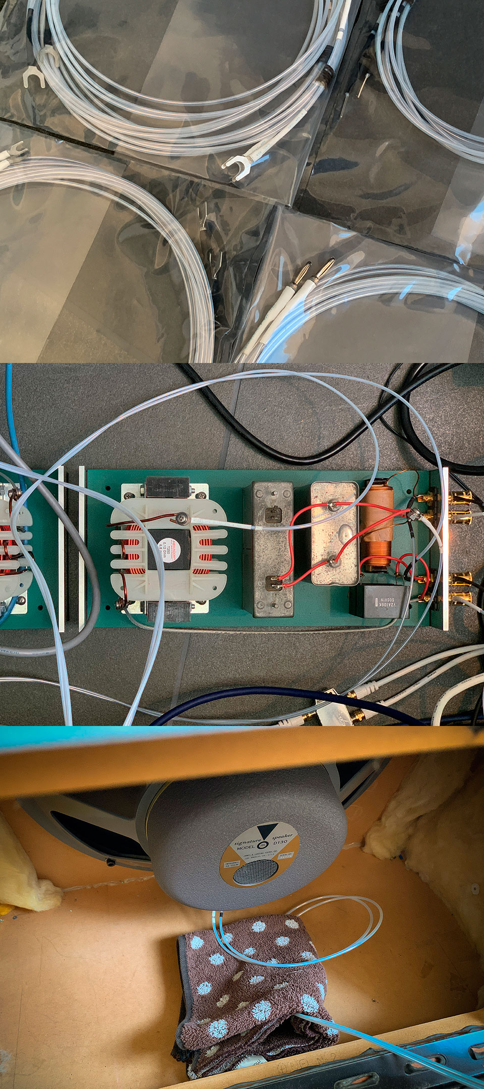 3 とりあえず、ネットワークからユニットまでを結線した。一気に全取っ替えを考えていたのだが、個別の変化量を知っておく必要があると思い考え直した。要はスピーカーシステムの内部配線だけを入れ換えた状態。アンプの出力は減衰させないまま、ユニットの端子にL型パッドを仕込んでいる。新しいケーブルの端子はすべて圧着処理でハンダを追放している。ウーファー本体の振動を緩和する意味では、端子部分だけ錦糸線を挿入する方法があるが、当初はダイレクト結線で試したが古いJBLのスプリング端子では点接触になってしまい力感に欠けるので前途の方法に戻った。この状態で、高域方向のニュアンスが従来と大きく異なった。響きは多めに感じるが塊にならず分離しているのでコアの音がしっかり出ている。固有の癖は感じず、6C33B OTLアンプを使っていたときの透明で艶やかな立ち方に近い印象をもった。