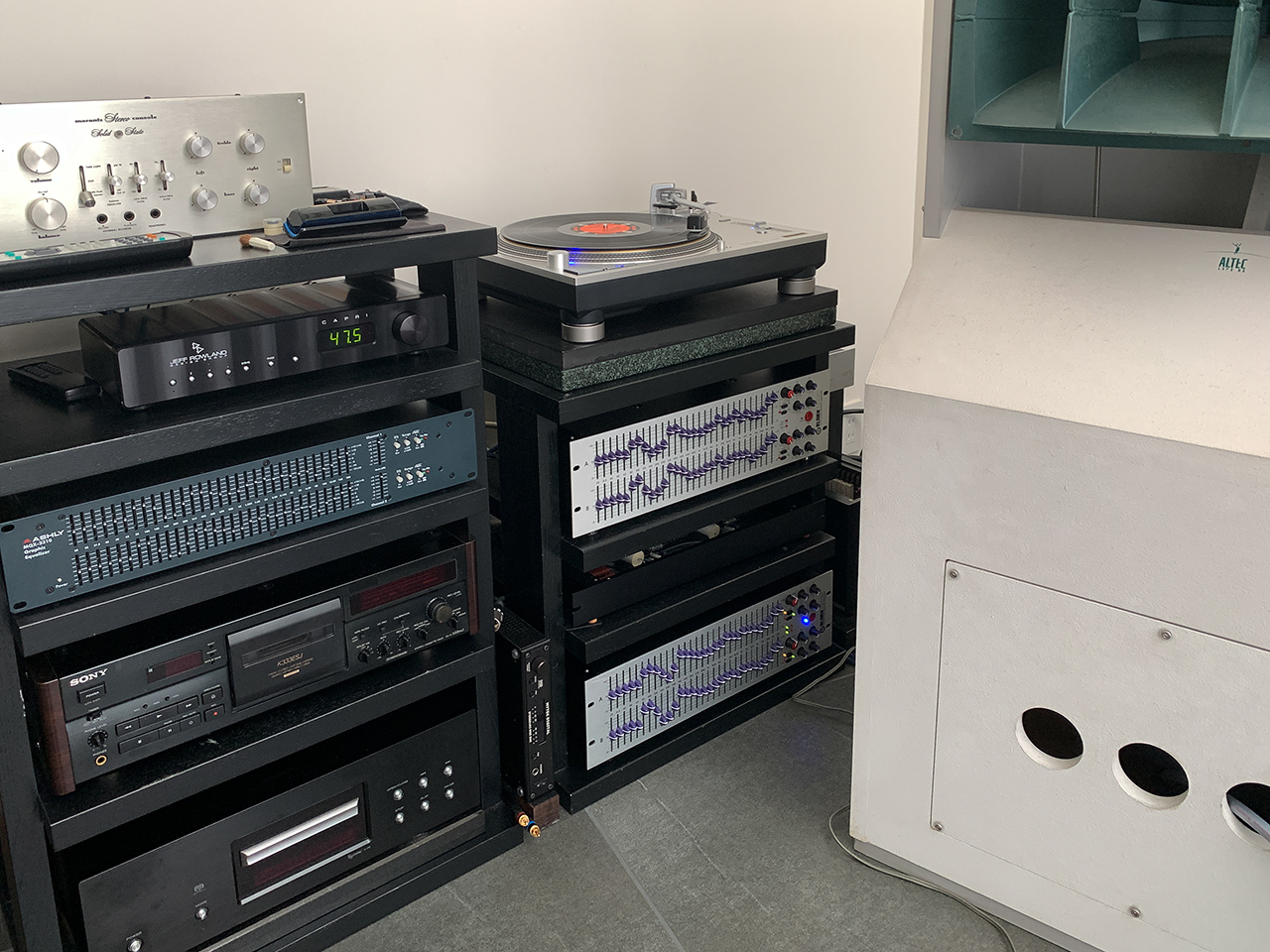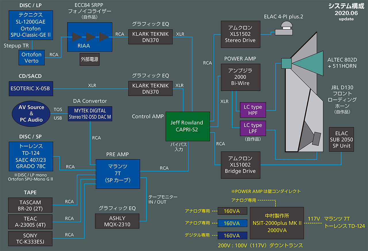 ALTEC 802Dの高域減衰はグラフィックイコライザーの補整とスーパーツイターELAC 4PIの投入で補っているのだが、もとより低能率の4PIの使い方としてはイレギュラーであり、専用パワーアンプで単独駆動させる方法を探っていたのだが、あわせて5基におよぶパワーアンプに同等の給電、信号ケーブルの分岐方法、誘導ノイズ対策など考えると、デメリットが多そうで具体的行動には至らなかった。 それが、この1月にELACのサブウーファーをiPhoneが認識できなくなり、内蔵ボードが修理から戻るまでということで、アムクロンのDSPパワーアンプをダイレクトに繋いだのが運のツキ。タイトに変貌した超低域に柔和な4PIがバランスしなくなってしまった。 という次第でスーパーツイター帯域を強靱化する必要に迫られたというのが、ダメ押しUpdateの理由である。 音声帯域を司る2Wayは自家製LCネットワークを介してアンプジラ2000で駆動するのは従来どおり、サブウーファーはアムクロンDSPアンプのブリッジ接続、スーパーツイターにクラウンのDSPアンプXLS1502を新たに導入した。アンプジラといいクラウンといい醜悪ともいえるフロントデザインであって、 それを5台も並べるってどういう神経なんだと我ながら思うがこれは仕方がない(笑) サウンドの追い込みには長い時間が必要だが、新たな可能性は明白で”広帯域カマボコ特性”という形容詞は返上しようと思っている。 |