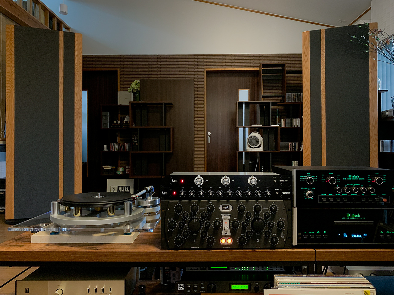 テープを装着してPLAYボタンを押し、ピンチローラーがキャプスタンシャフトに接触してテープが送られる。その際ざわざわしたノイズが気になり、原因を探るとキャプスタンシャフトが手前にせり上がり不規則なノイズを発生させていた。 依頼したレストアラーに状況を話すと、試作中のベアリング仕様ピンチローラーを試して欲しいとのことで換装。問題はあっさり解消。ピンチローラーのゴム面の垂直問題か? 業務用途では気にならない瑕疵がリスニング環境では問題になる(笑) このBR-20は、通常とは逆にピンチローラーはテープ磁性体面側にある。右側に見えるベアリング仕様の特大インピーダンスローラーとともに、テープを徹底保護する設計姿勢が素晴らしい! 信頼できるレストアラー氏に出会わなかったらオープンテープオーディオは復活出来なかっただろう。あらためて感謝! |