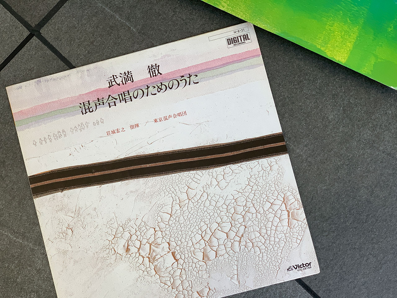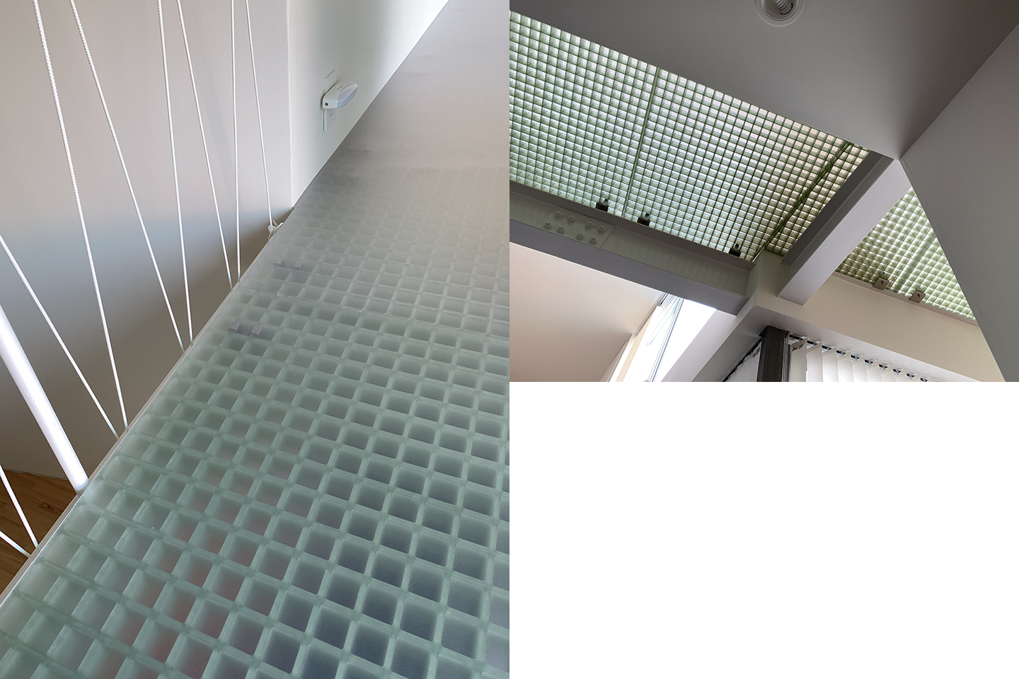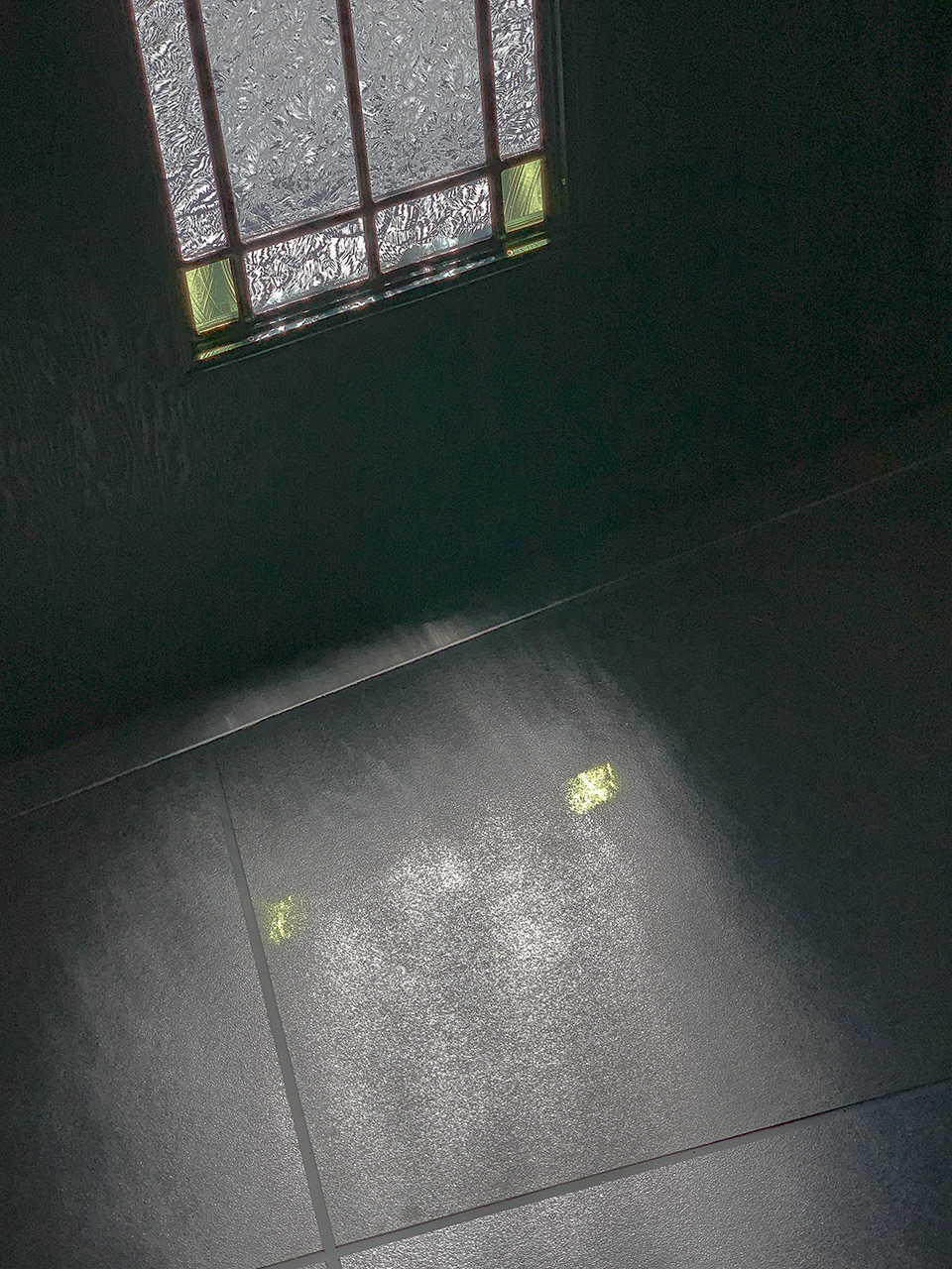 玄関ドアと内部の土間である。もともとスチール製の黒いドアだったが、非常に質量があり家人には開閉さえ難儀だったのだ。これを木製に変更して中央にステンドグラスを埋め込んだ。ガラスは基本無色で四隅に色ガラスを配している。木製ドアはこの写真では分かりづらいが、木目を活かしたダークグリーンのペイント。石張りに見える床は実はタイルであるが、目地の黒が納得できずミディアムグレーに塗り直した。これは四年間の実験のうえで、ボルベイン社のアクリルガッシュ二種を調色したが、微妙な色加減で印象は劇変する。一階の床はすべて同じ仕様である。設計家の意図したストイックな意匠からは相当に逸脱したと思うが・・・ |