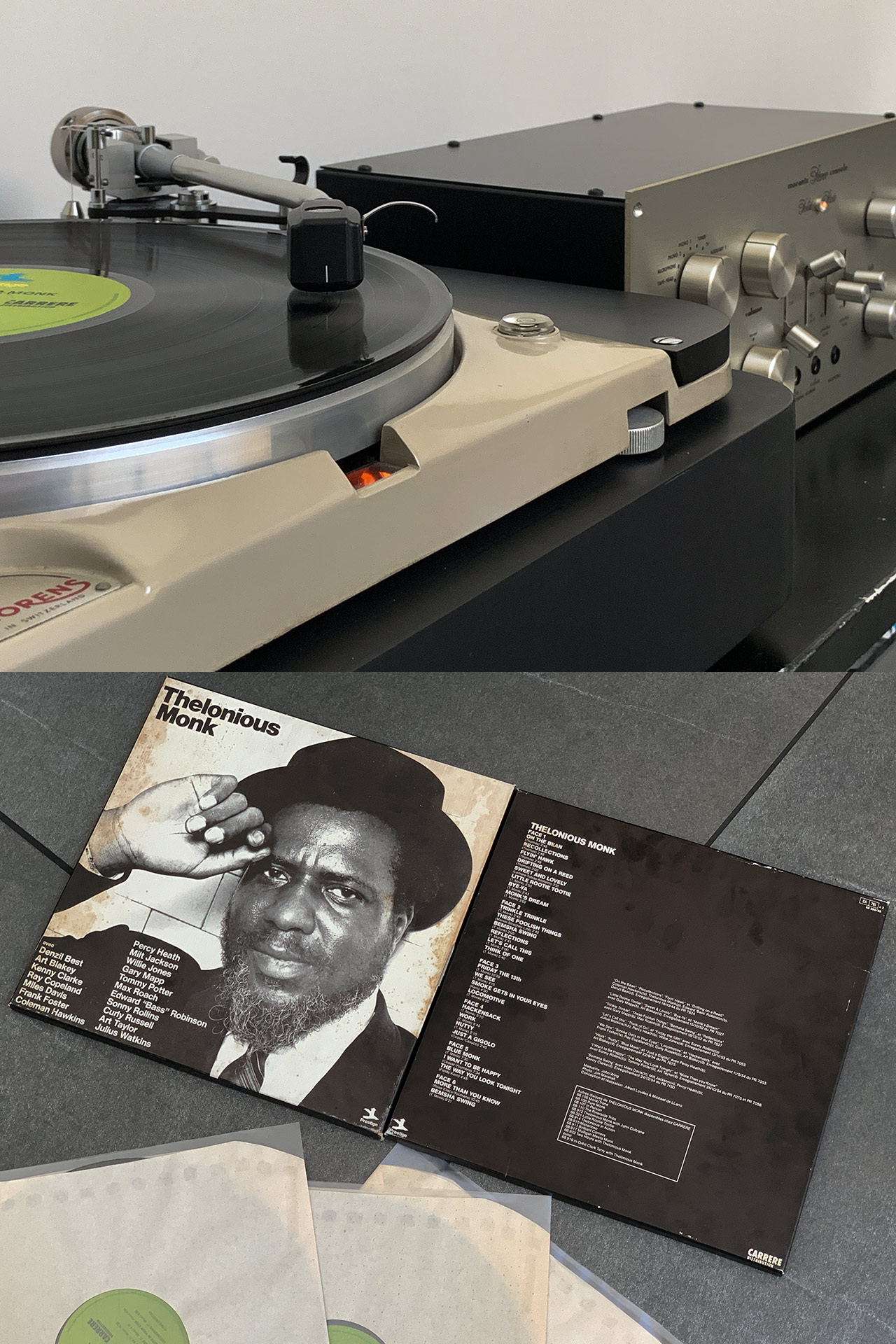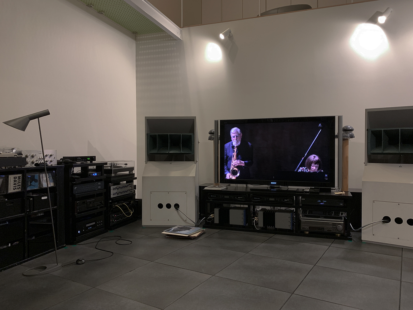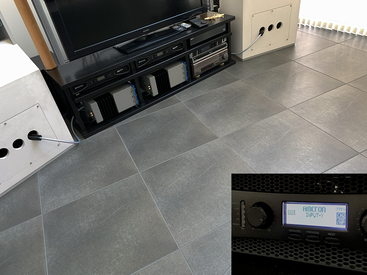 玄関ドアと内部の土間である。もともとスチール製の黒いドアだったが、非常に質量があり家人には開閉さえ難儀だったのだ。これを木製に変更して中央にステンドグラスを埋め込んだ。ガラスは基本無色で四隅に色ガラスを配している。木製ドアはこの写真では分かりづらいが、木目を活かしたダークグリーンのペイント。石張りに見える床は実はタイルであるが、目地の黒が納得できずミディアムグレーに塗り直した。これは四年間の実験のうえで、ボルベイン社のアクリルガッシュ二種を調色したが、微妙な色加減で印象は劇変する。一階の床はすべて同じ仕様である。設計家の意図したストイックな意匠からは相当に逸脱したと思うが・・・ |