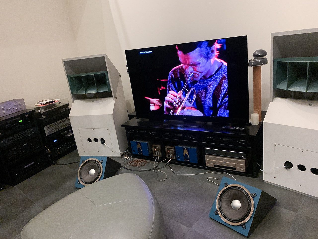 従来スーパーツイターELAC 4PIはスタンド設置でALTECホーンの横に配置していたが、祭壇の燭台のような外観がイヤなのでサブウーファーの中央に置いた。位置的には懸念もあるが、見た目と安定性を優先。改造サブウーファーと4PI、ELAC製拡張ディバイス群(笑)はメインスピーカーの奥にある。写真は完成形。バックライトも効果的になり、音のヌケ感と見晴らしが大幅に向上した印象あり。 |