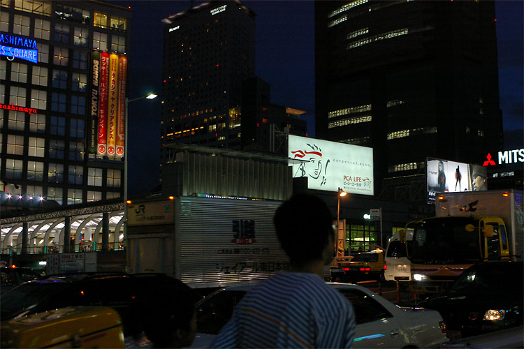 | 前回までの新宿の夜景写真は手持ち撮影なので、750/500pxでは気にならないとしても実際はかなりブレている。シャッター速度は1/8から1/30くらいが多い。スナップは対象との位置関係と視線が命なので、三脚類は使わない。というか手ぶれには寛容なのだ(笑)。もうひとつ言えば、動体がぴたっと静止している写真も不自然な感じがするんだよねえ。(PENTAX*istD FA35mm F2AL) |