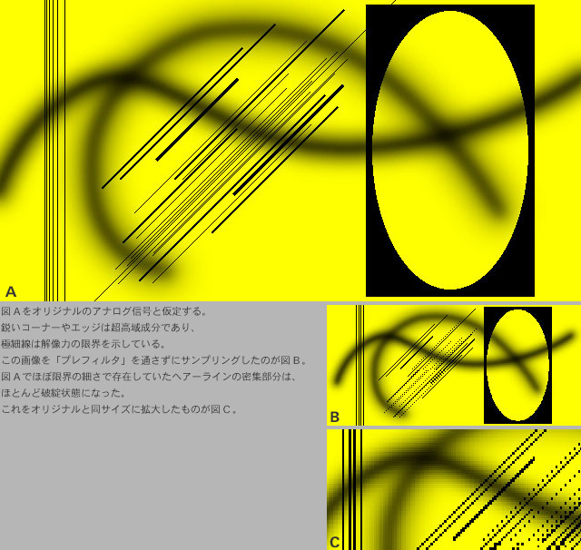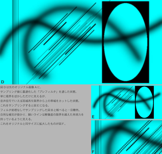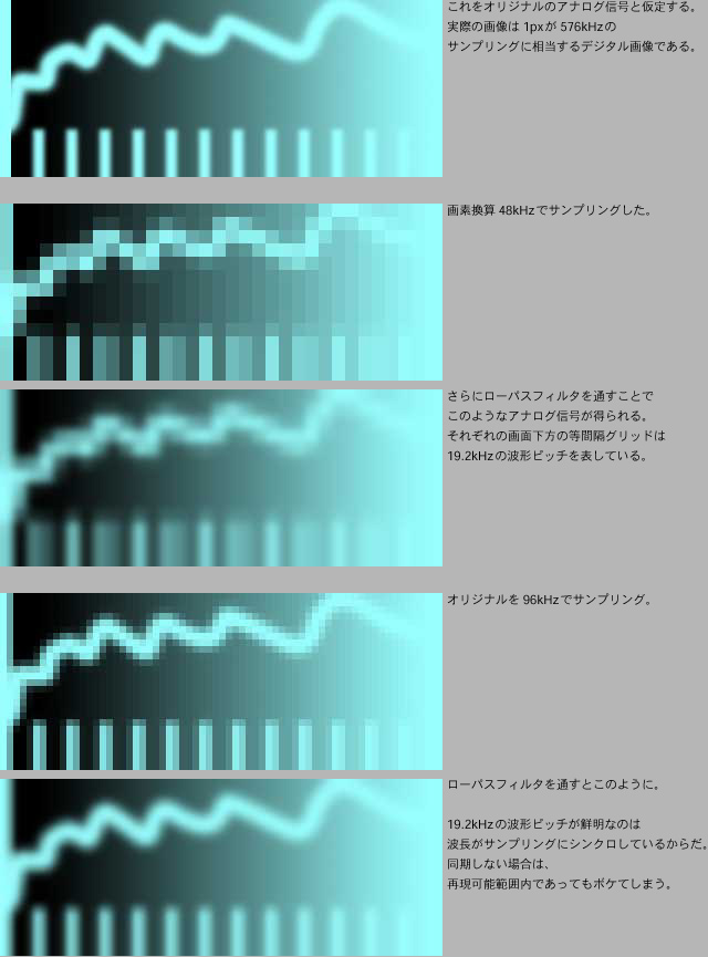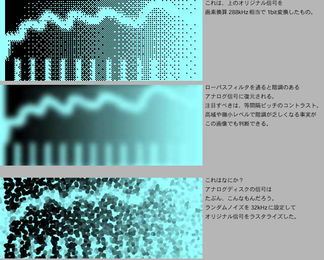 では、オーディオ分野でこの手法を実行するにはどうしたよいか? 時間軸の分割(サンプリング)を不定形にすることしか考えが浮かばない。量子化(階調)のための幾つかのレイヤーと、輪郭保持のための別レイヤーを合成するD/A変換なんかは想像するだけでこころときめく(笑) 現行の2.8224MHz1bitのDSDだって未来のDSPで再構築できるだろう。